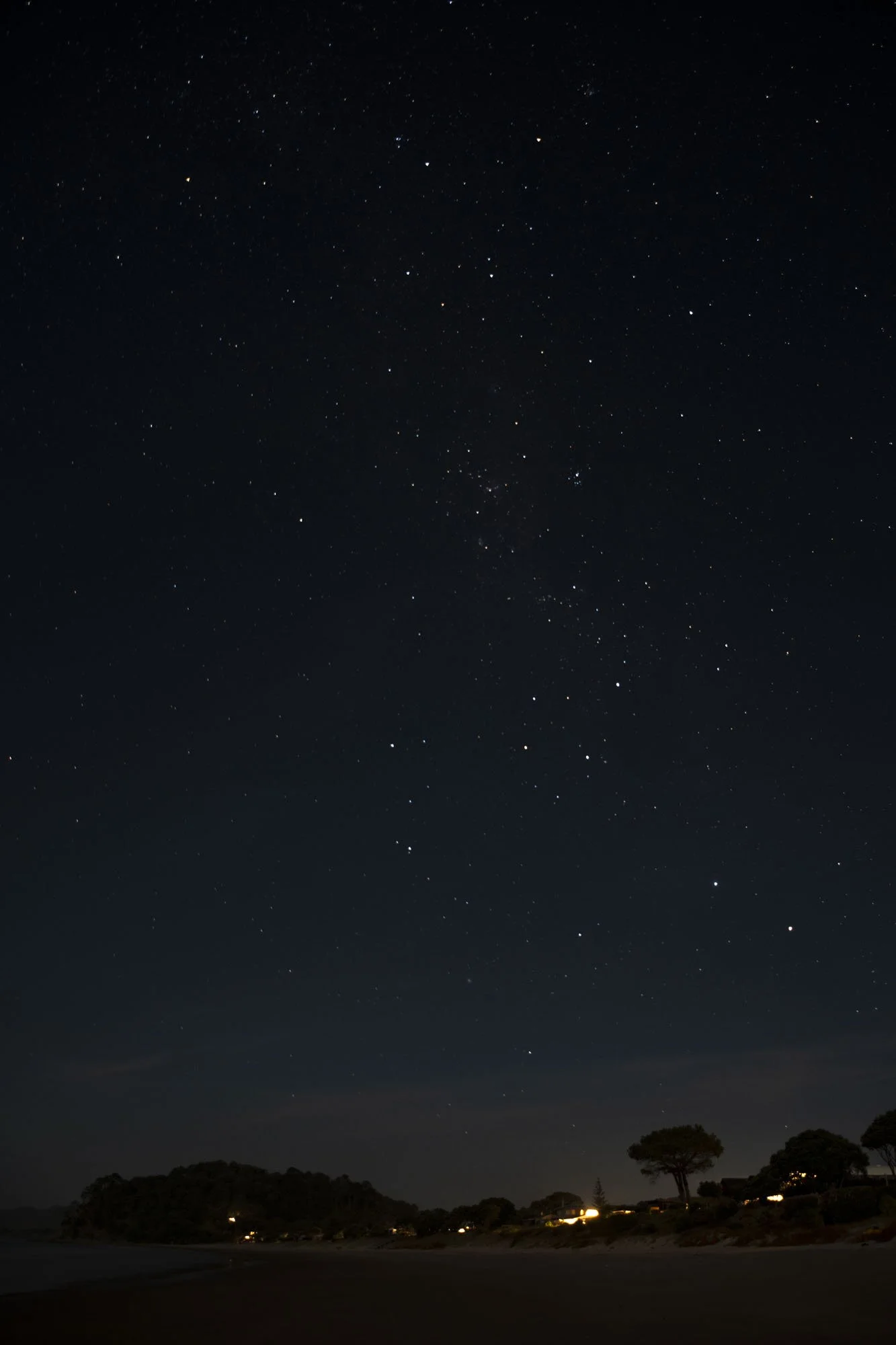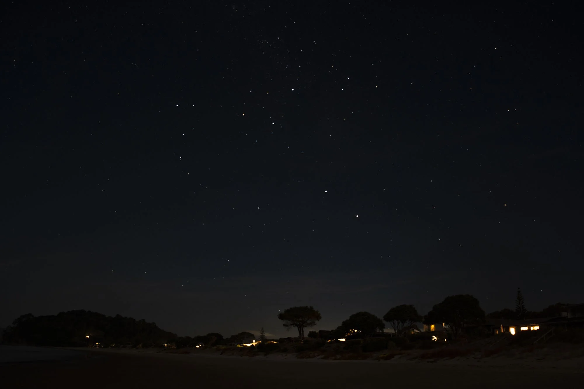 Night Sky at Whangapoua Beach showing the Southern Cross Constellation. Mitsubishi Neon, and Cambridge White Church.